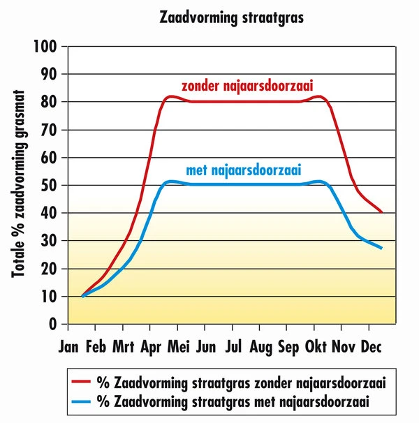 Geselecteerde grassoorten voor snelle kieming ook in de winter en bij lage temperaturen vanaf 6 °C. Door ook in deze periode van het jaar het gazon te herstellen kunnen mos, onkruid en straatgras tegen worden gegaan.