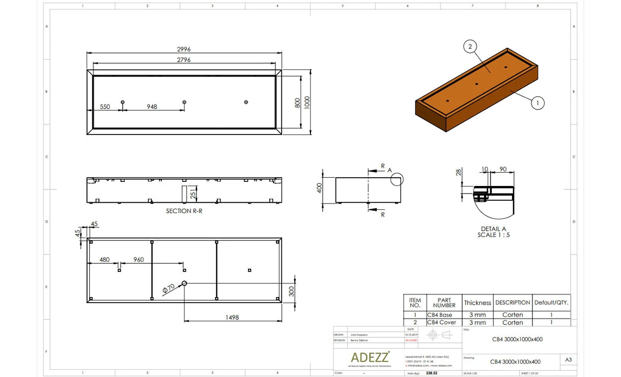 De rechthoekige cortenstalen watertafel van Adezz is drie meter lang en één meter breed. De cortenstalen watertafel van Adezz heeft een warme en natuurlijke uitstraling door de roestbruine kl drie meter lang en één meter breed. De cortenstalen watertafel van Adezz heeft een warme en natuurlijke uitstraling door de roestbruine kleur. Deze onts eur. Deze ontstaat door een natuurlijk roestproces. De oxidelaag zorgt voor een fraaie kleur en beschermt het onderliggende metaal. Deze mooie watertafel is een stijlvolle toevoeging in uw tuin!